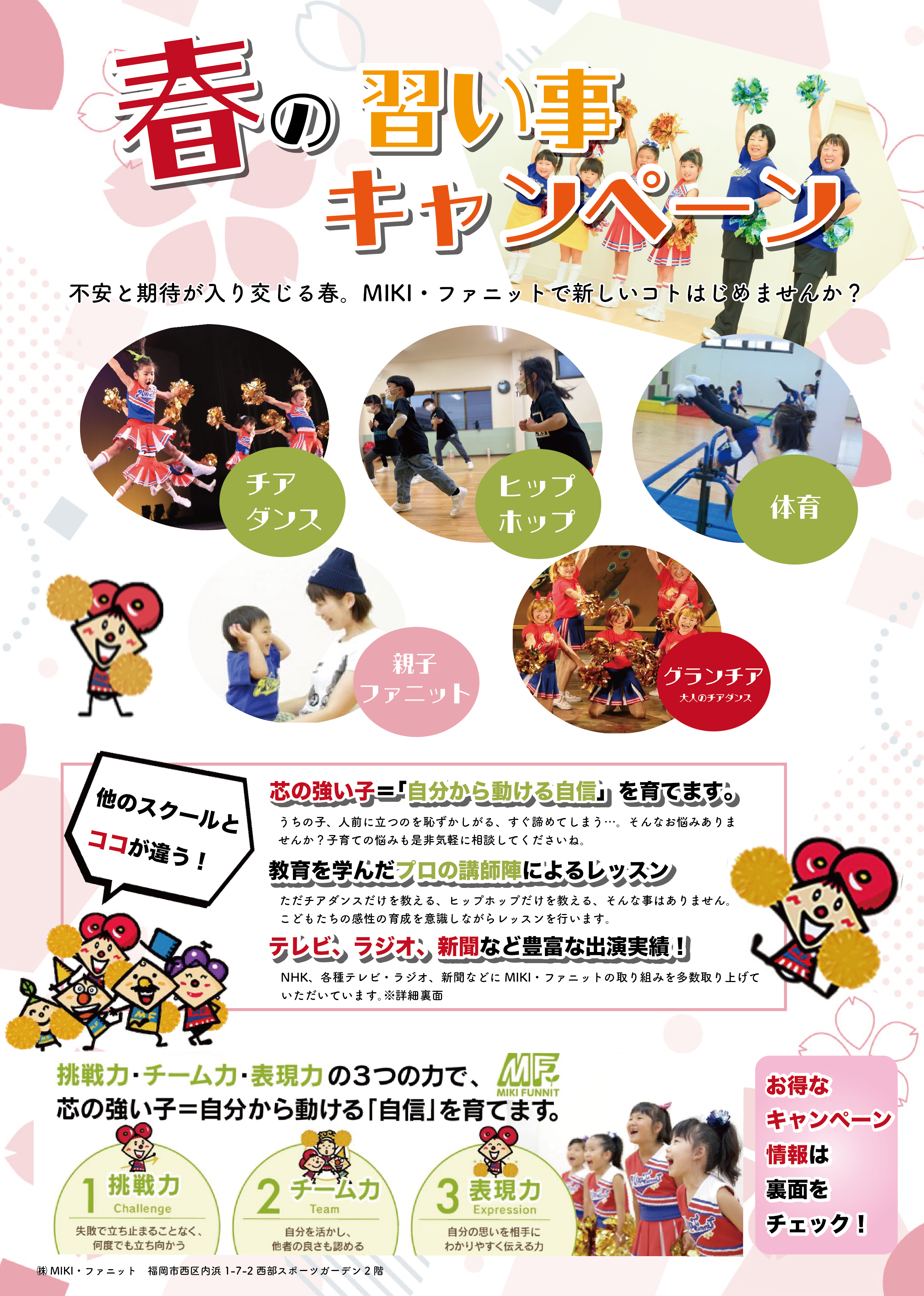 0歳からのベビー・親子クラスを始め、2歳半からのチアダンス・チアリーディング・HIPHOP・体育などの多彩なクラスを展開中。詳しくはWebサイトへ!